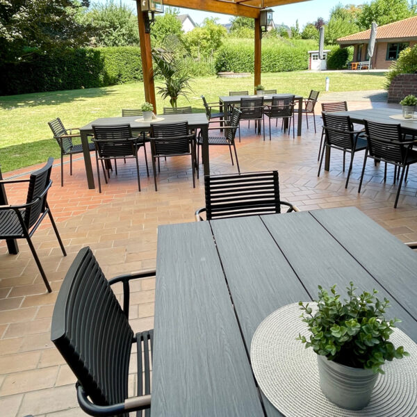 Die überdachte Außenterasse lädt bei schönem Wetter zum Verweilen und Plaudern ein.